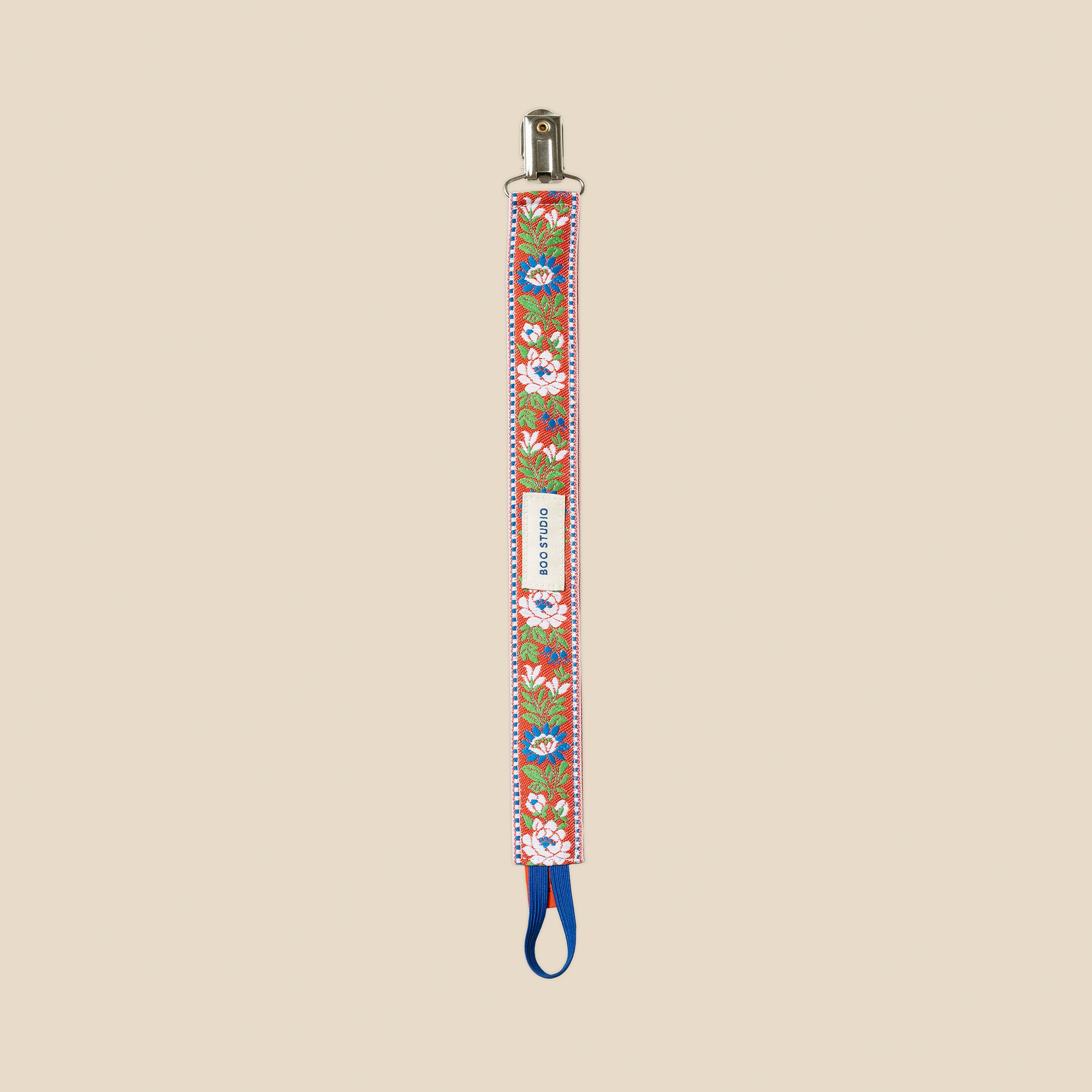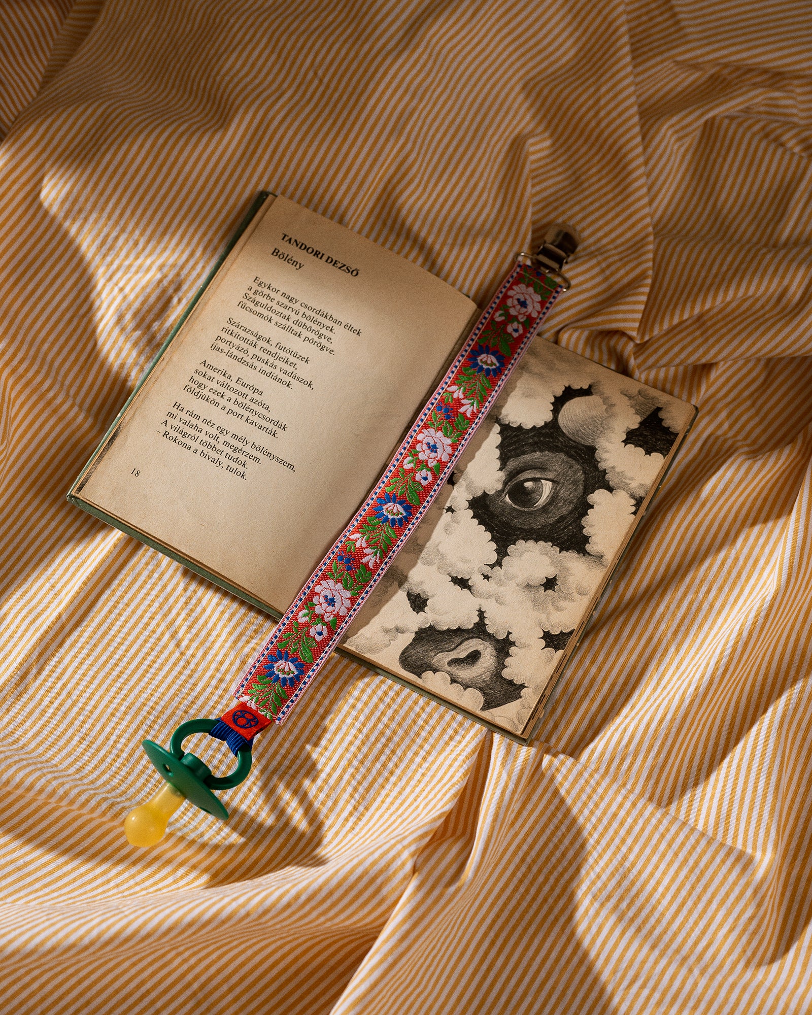 Say goodbye to dropped pacifiers with these handmade clips, crafted from traditional Hungarian folklore ribbon. On one end, a clip securely attaches to your baby's clothing, while the other end allows you to thread the pacifier onto the elastic band. Available in four color variants, they offer easy access and are made to stay in place.