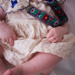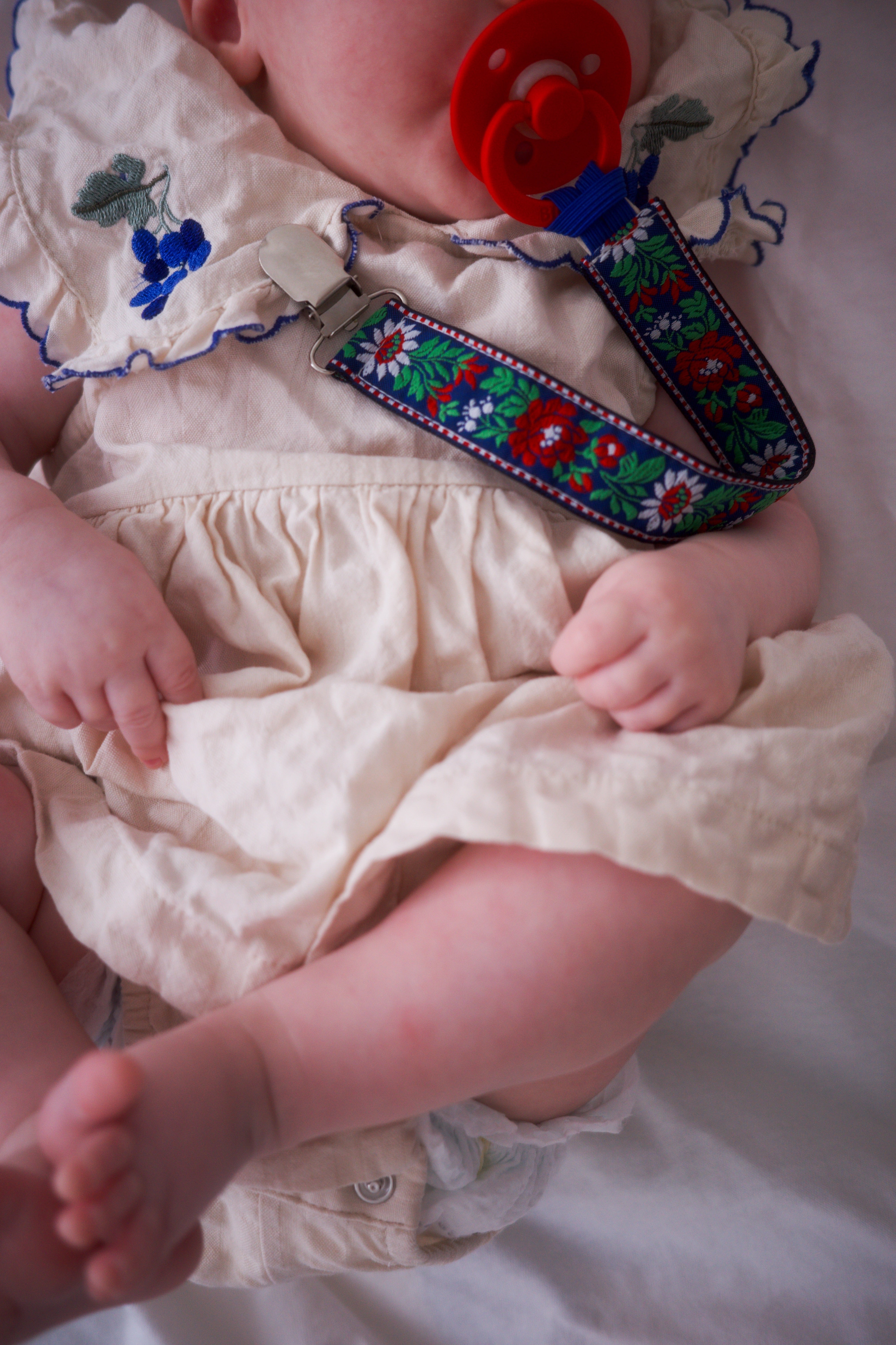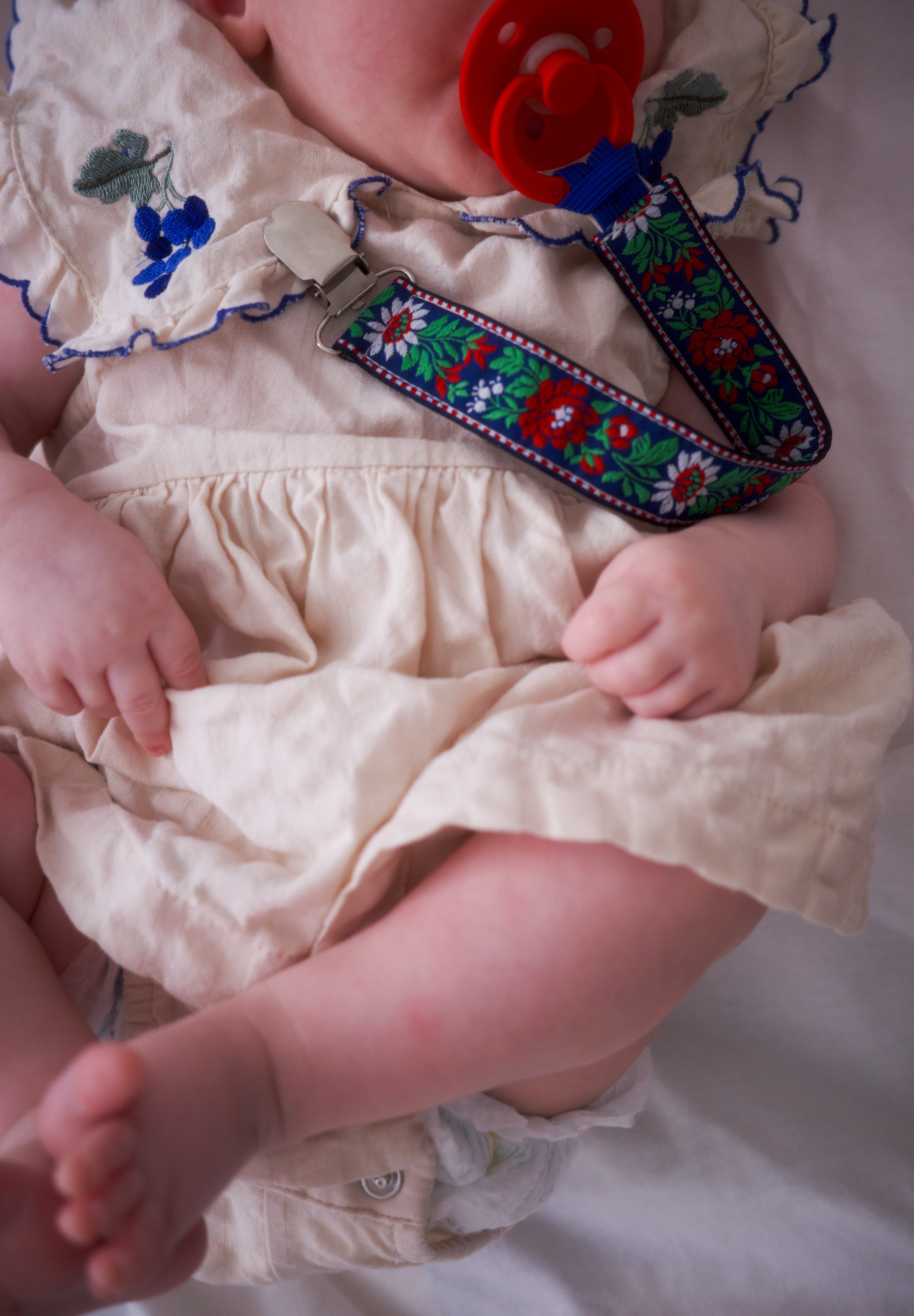 Say goodbye to dropped pacifiers with these handmade clips, crafted from traditional Hungarian folklore ribbon. On one end, a clip securely attaches to your baby's clothing, while the other end allows you to thread the pacifier onto the elastic band. Available in three variants, they offer easy access and are made to stay in place.
